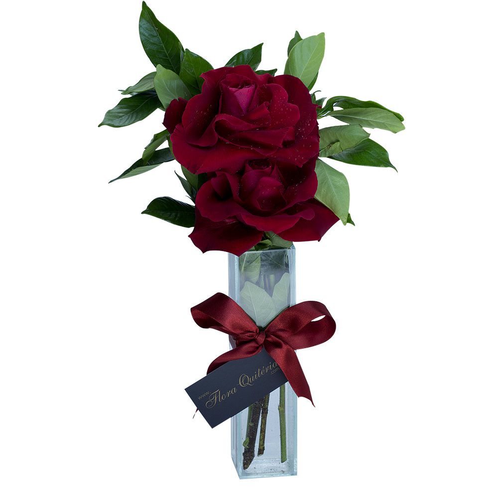 1 solitário de vidro e 2 rosas colombianas com folhagem de gardênias com um laço de cetim.